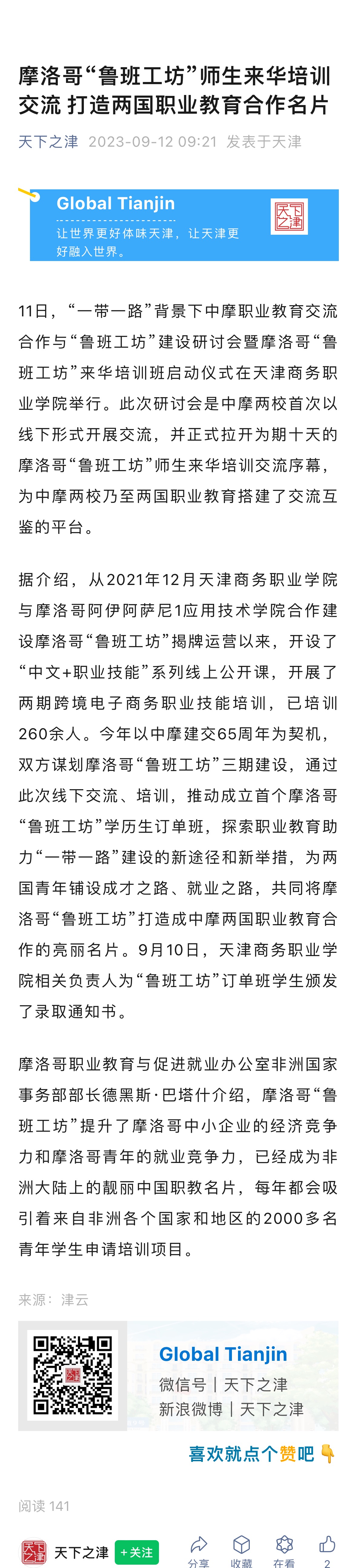 2023年9月12日,天津市人民政府外事辦公室(天津市人民政府港澳工作辦公室)認(rèn)證“天下之津”微信公眾號(hào),報(bào)道摩洛哥“魯班工坊”師生來(lái)我校培訓(xùn)交流,打造兩國(guó)職業(yè)教育合作名片。