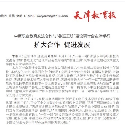 9月11日,“一帶一路”背景下中摩職業教育交流合作與“魯班工坊”建設研討會暨摩洛哥“魯班工坊”來華培訓班啟動儀式在天津商務職業學院舉行。