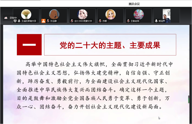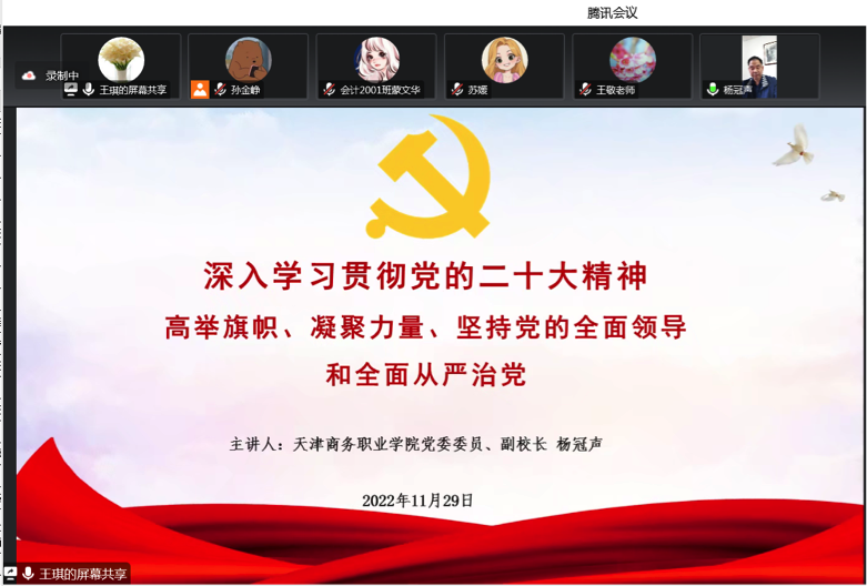 為認(rèn)真學(xué)習(xí)、深刻領(lǐng)會(huì)、全面貫徹黨的二十大精神,11月29日下午,學(xué)校黨委委員、副校長楊冠聲通過線上視頻會(huì)議,為會(huì)計(jì)學(xué)院全體黨員做題為《高舉旗幟、凝聚力量、堅(jiān)持黨的全面領(lǐng)導(dǎo)和全面從嚴(yán)治黨》黨的二十大精神專題宣講。