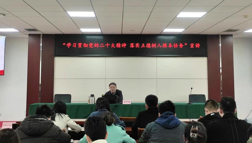 近日,為深入學習宣傳貫徹黨的二十大精神,幫助全校輔導員準確把握黨的二十大精神實質,引導輔導員把學習的成果轉化為開展工作的本領和推進工作的舉措,校黨委副書記徐琤穎同志為輔導員進行了題為“學習貫徹黨的二十大精神 落實立德樹人根本任務”的主題宣講。