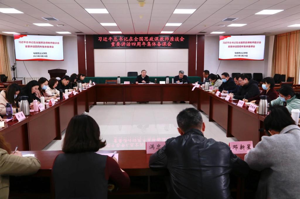 在習近平總書記發(fā)表學校思想政治理論課教師座談會重要講話四周年之際,為深入學習貫徹落實習近平總書記重要講話重要指示精神,全面學習貫徹黨的二十大精神,進一步落實立德樹人根本任務,我校以“推進黨的二十大精神融入課堂,充分發(fā)揮思政課鑄魂育人功能”為主題舉辦習近平總書記在學校思想政治理論課教師座談會上重要講話發(fā)表四周年集體備課會。會議由學校黨委副書記徐琤穎同志主持,學校黨委書記宮寶利同志出席了集體備課會。學校黨委宣傳部、黨委教師工作部、黨委學生工作部、團委主要負責同志、馬克思主義學院全體思政課教師參加本次集體備課會。