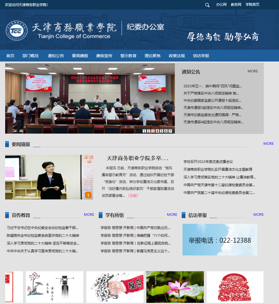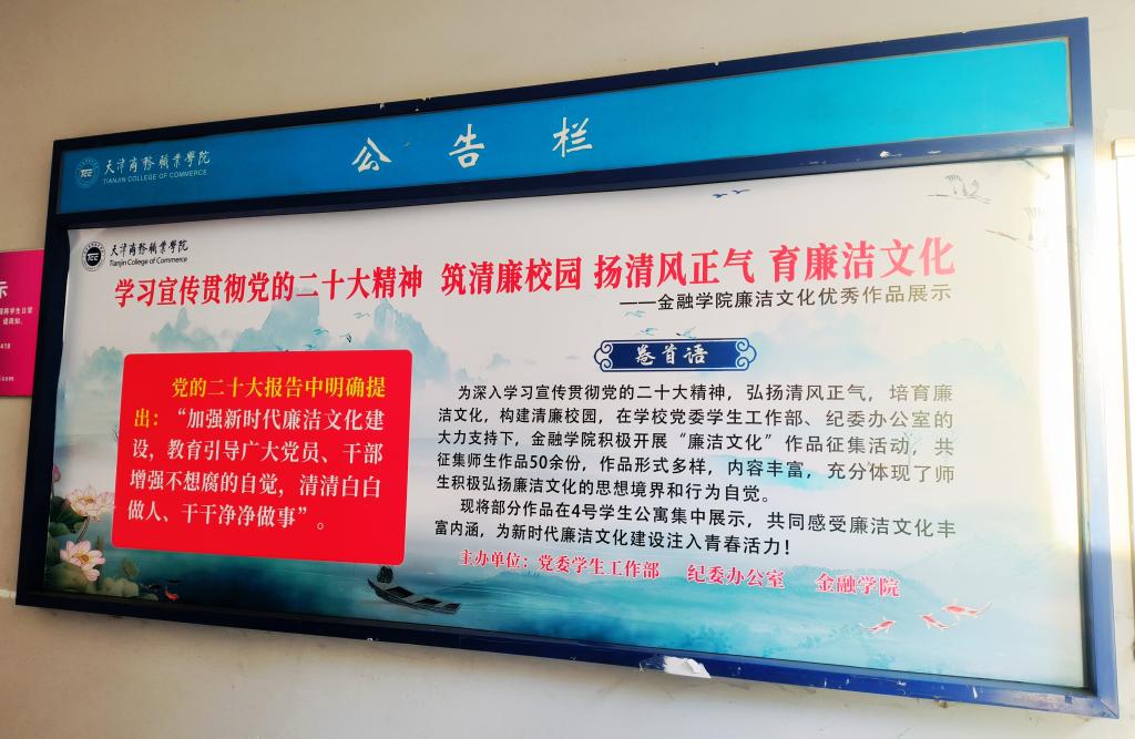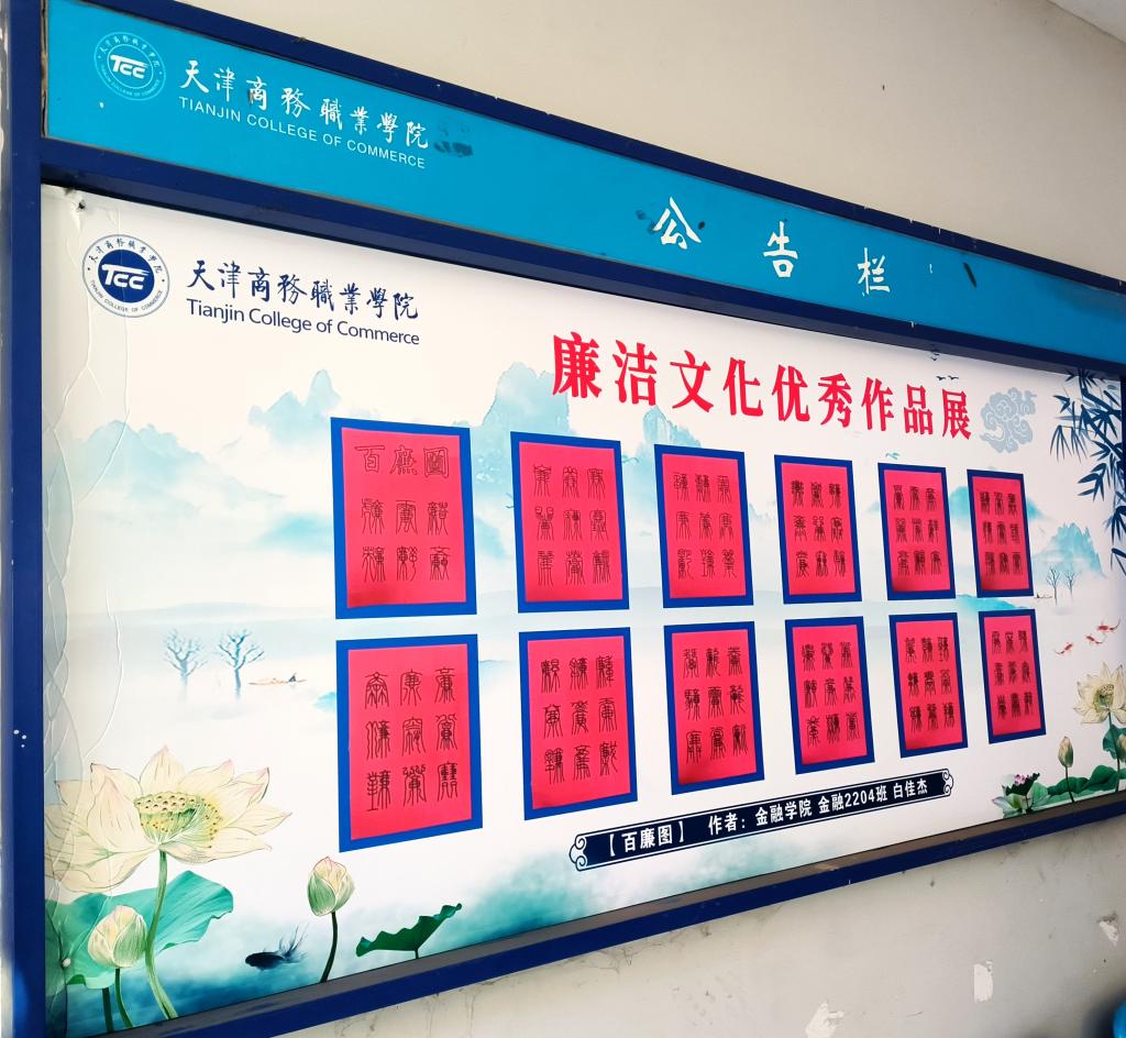 為進一步加強新時代廉潔文化和清廉商職建設,天津商務職業學院黨委、紀委緊密結合職業院校文化特色,采用線上線下相結合方式,圍繞廉潔文化、警示教育、黨性教育三個方面,在學校行政樓、圖書館、教學樓、學生公寓等重點區域,積極探索打造學校廉潔文化“微陣地”和流動“廉潔宣傳欄”,初步形成了地標陣地、流動宣傳、覆蓋全面的廉潔文化建設格局。