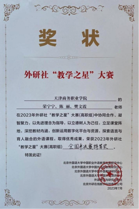 7月25日,2023年外研社“教學之星”大賽(高職組)(第二期)全國半決賽在西安成功舉辦,公共外語教學部教師榮寧寧、陳麗和樊文霞組成的參賽團隊,經過激烈角逐,現(xiàn)場斬獲全國半決賽特等獎第一名,成功晉級2023年外研社“教學之星”大賽(高職組)總決賽,取得我校參與該項賽事的歷史性突破。