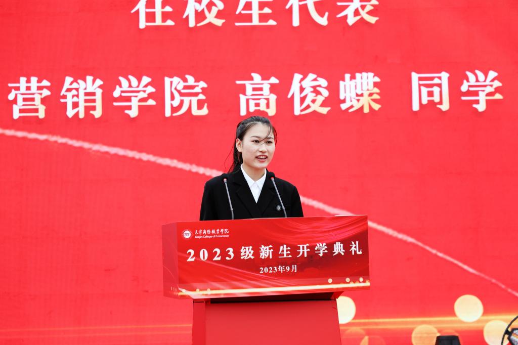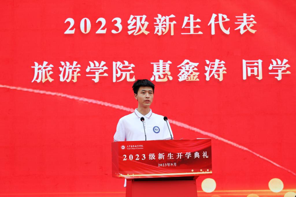 新生代表,旅游學院茶藝與茶文化專業2302班惠鑫濤同學真誠感謝老師和同學們的友愛與關切,表示對人生新征程的憧憬與期待,和堅定理想信念、肩負時代重任,努力成長為堪當民族復興重任的時代新人的決心。