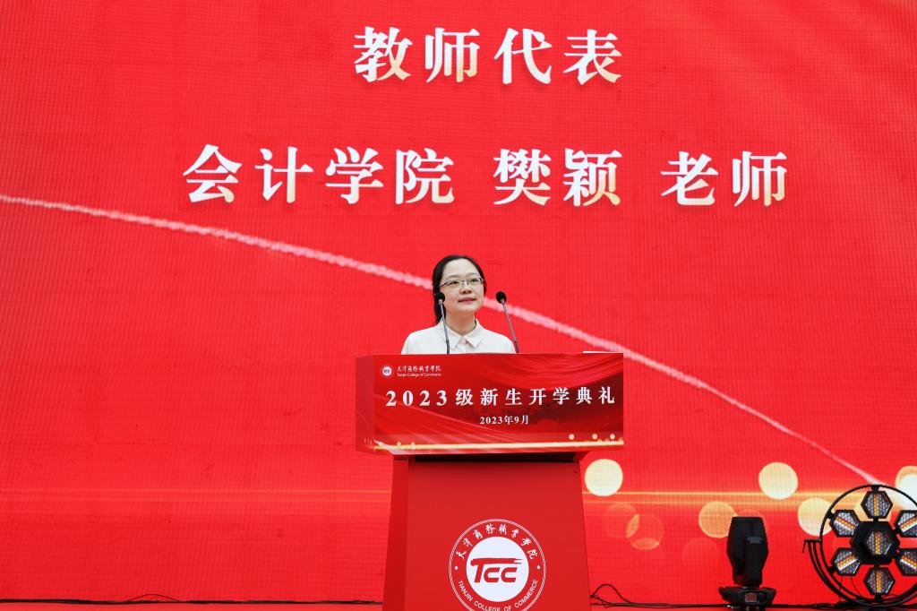 學校2022年、2023年度優秀教師,會計學院樊穎老師代表全校教師,深情表達老師們都愿傾其所有,全力以赴,助力學生登高行遠;勉勵新生們樹立明確的人生目標,自信堅強,不懈努力,在未來創造出璀璨的成績。