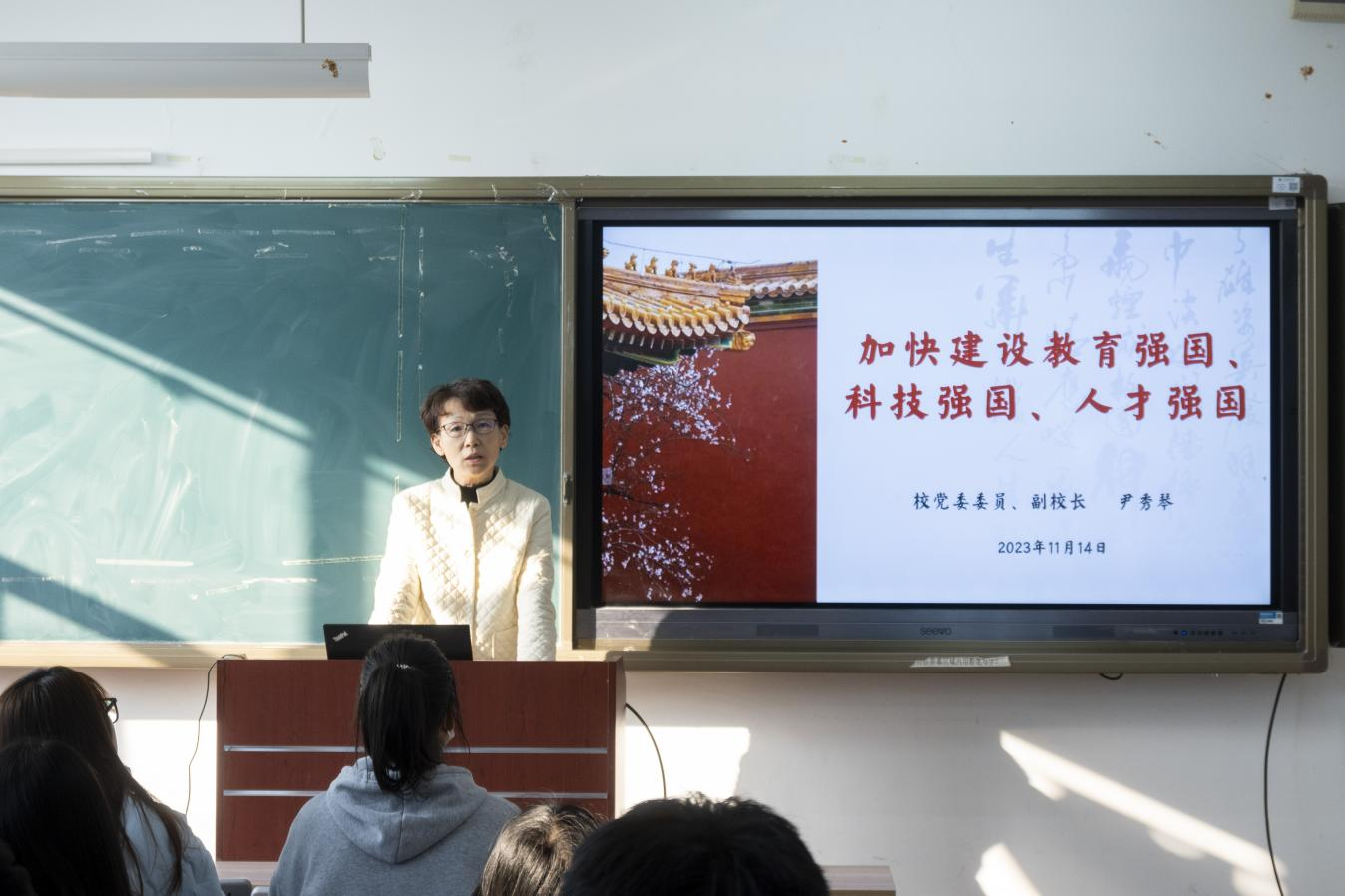 下午,尹秀琴副校長參加了聯系班級“青春向黨淬初心、踔厲奮發譜新篇”主題班會,為同學們講授了一堂“加快建設教育強國、科技強國、人才強國”的形勢政策課,并與學生代表進行座談。尹秀琴副校長勉勵同學們在新的征程上,要自信自強、守正創新,胸懷愛國之心、厚植強國之志,為全面建設社會主義現代化國家、全面推進中華民族偉大復興貢獻自己的青春力量。