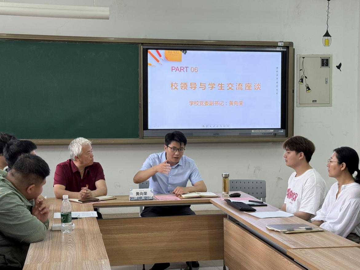 近日,學(xué)校黨委副書記黃向榮深入聯(lián)系班級(jí)開展交流活動(dòng),為同學(xué)們講授形勢與政策課、聽課、參加主題班會(huì),與學(xué)生代表座談、共進(jìn)午餐,并深入學(xué)生宿舍開展調(diào)查研究工作。