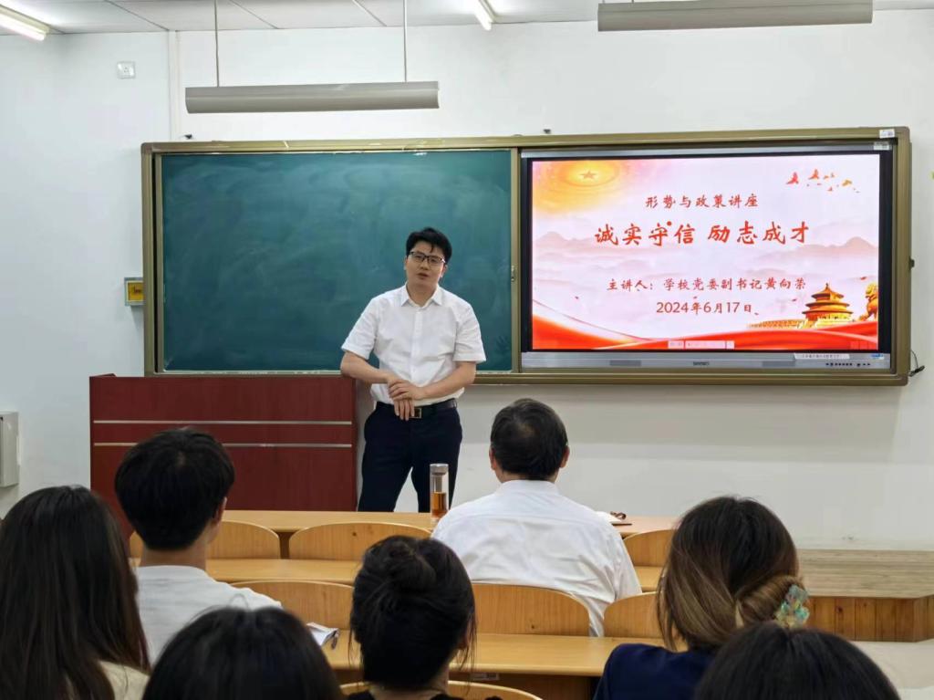 黃向榮副書記來到信息技術(shù)學(xué)院教學(xué)樓H307教室與其聯(lián)系班級(jí)學(xué)生一起聽外聘教師講授《數(shù)據(jù)庫應(yīng)用技術(shù)》課,深入了解課堂教學(xué)情況,聽課結(jié)束后黃向榮副書記鼓勵(lì)同學(xué)們要努力學(xué)好專業(yè)知識(shí),用知識(shí)武裝頭腦,用技能把握未來。并參加聯(lián)系班級(jí)的“誠信教育”主題班會(huì),通過講述經(jīng)典故事、學(xué)生交流研討、簽署誠信承諾書等方式向同學(xué)們闡釋了誠信在學(xué)習(xí)生活中的重要作用。隨后,黃向榮副書記以“誠實(shí)守信 勵(lì)志成才”為題,為軟件2301班全體同學(xué)講授了一堂生動(dòng)、精彩的形勢與政策課,從四個(gè)方面詳細(xì)講解了誠信的內(nèi)涵、本質(zhì)及其在工作生活中的作用與意義,強(qiáng)調(diào)誠信是中華優(yōu)秀傳統(tǒng)文化的重要組成部分。并向同學(xué)們提出了三點(diǎn)要求:一是要養(yǎng)成誠實(shí)守信的意識(shí)與習(xí)慣;二是要廣泛宣傳誠實(shí)守信的作用與意義;三是在日常工作生活中要誠實(shí)守信,勵(lì)志成才,努力使自己成為堪當(dāng)民族復(fù)興重任的時(shí)代新人。