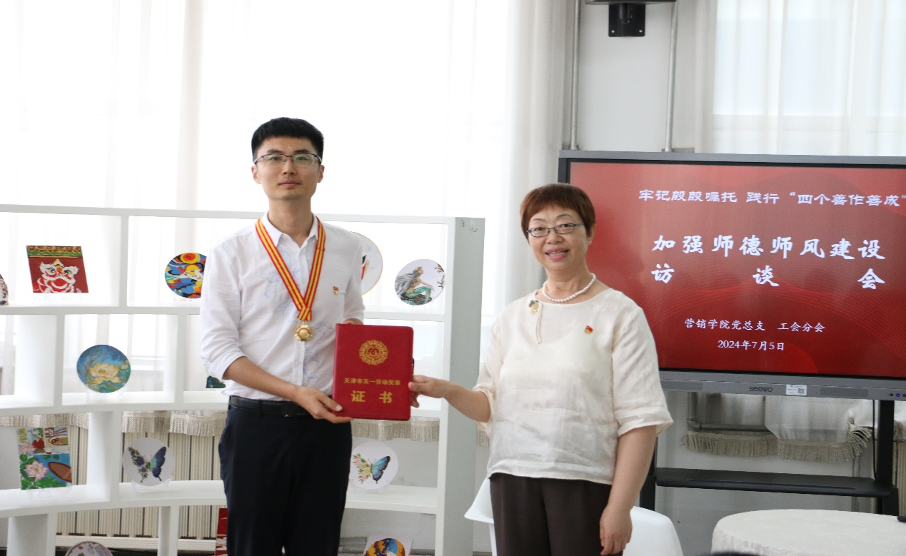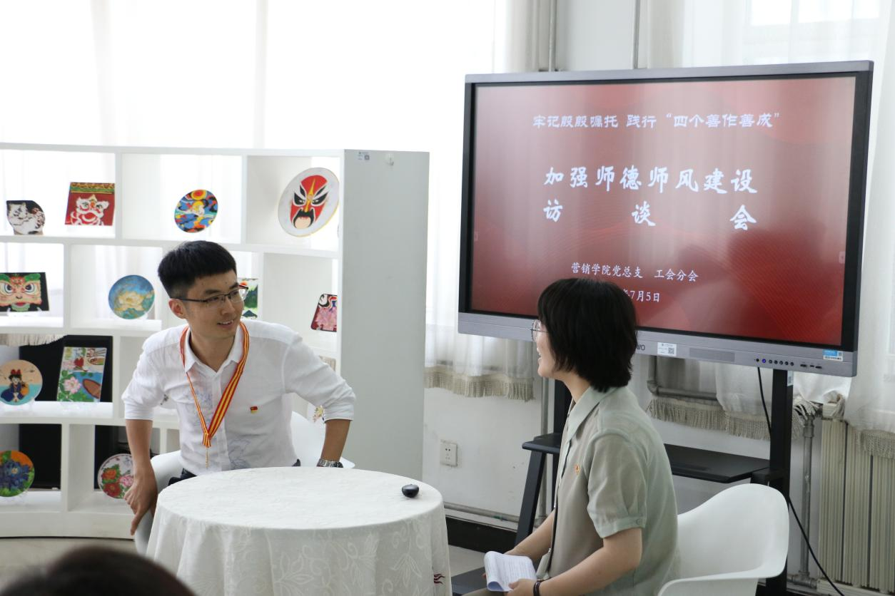 為進一步學習貫徹習近平總書記視察天津重要講話精神,全面加強師德師風建設,弘揚愛崗敬業精神,辦好人民滿意的教育,營銷學院黨總支、工會分會于7月5日召開了牢記殷殷囑托 踐行“四個善作善成”加強師德師風建設訪談會,校工會主席許艷紅同志出席會議,學院共60余名師生參加會議。