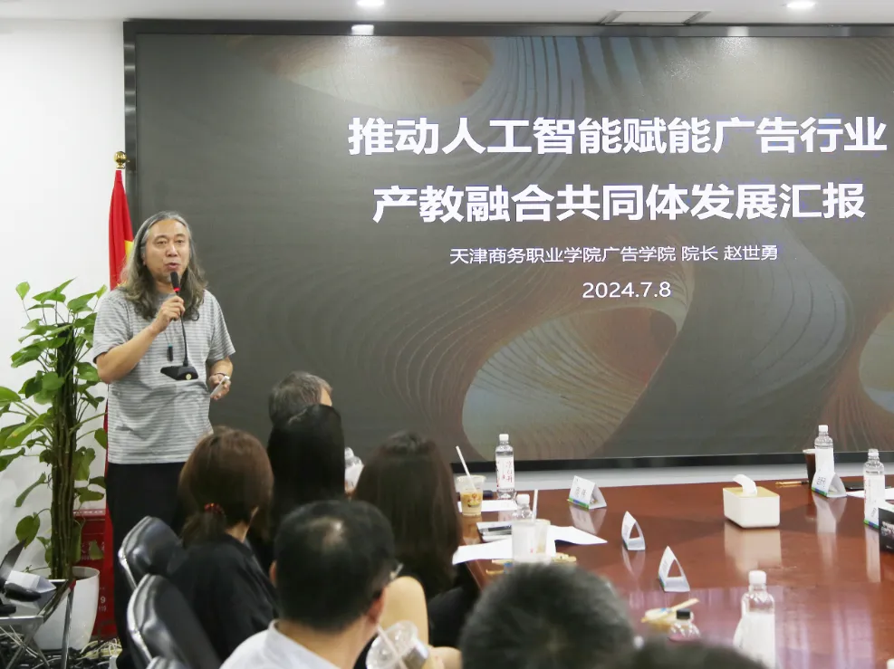天津商務職業學院廣告學院院長、全國人工智能廣告行業產教融合共同體秘書長趙世勇在會上作“推動人工智能賦能廣告行業產教融合共同體發展”專題發言。趙世勇院長向與會領導、嘉賓匯報了天津商務職業學院廣告學院在“三轉三進”教改理念引領下,聚焦行業需求調整教學內容,通過引入AI技術,優化課程結構,實現教學與產業無縫對接的創新實踐成果與組織變革,倡導建立廣告產業產教融合共同體,推動職業教育向更高層次發展。