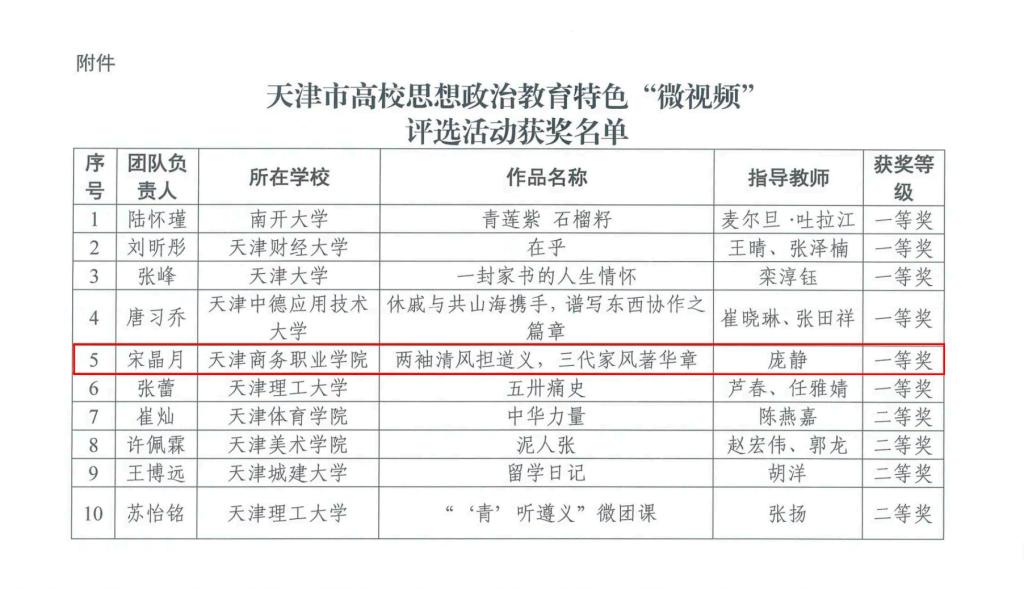 日前,市教育兩委公布了2023年天津市高校思想政治教育特色“微視頻”評(píng)選結(jié)果,我校馬克思主義學(xué)院龐靜老師指導(dǎo)的金融學(xué)院國(guó)際金融專業(yè)2201班宋晶月同學(xué)創(chuàng)作的作品《兩袖清風(fēng)擔(dān)道義 三代家風(fēng)著華章》榮獲賽事一等獎(jiǎng)。