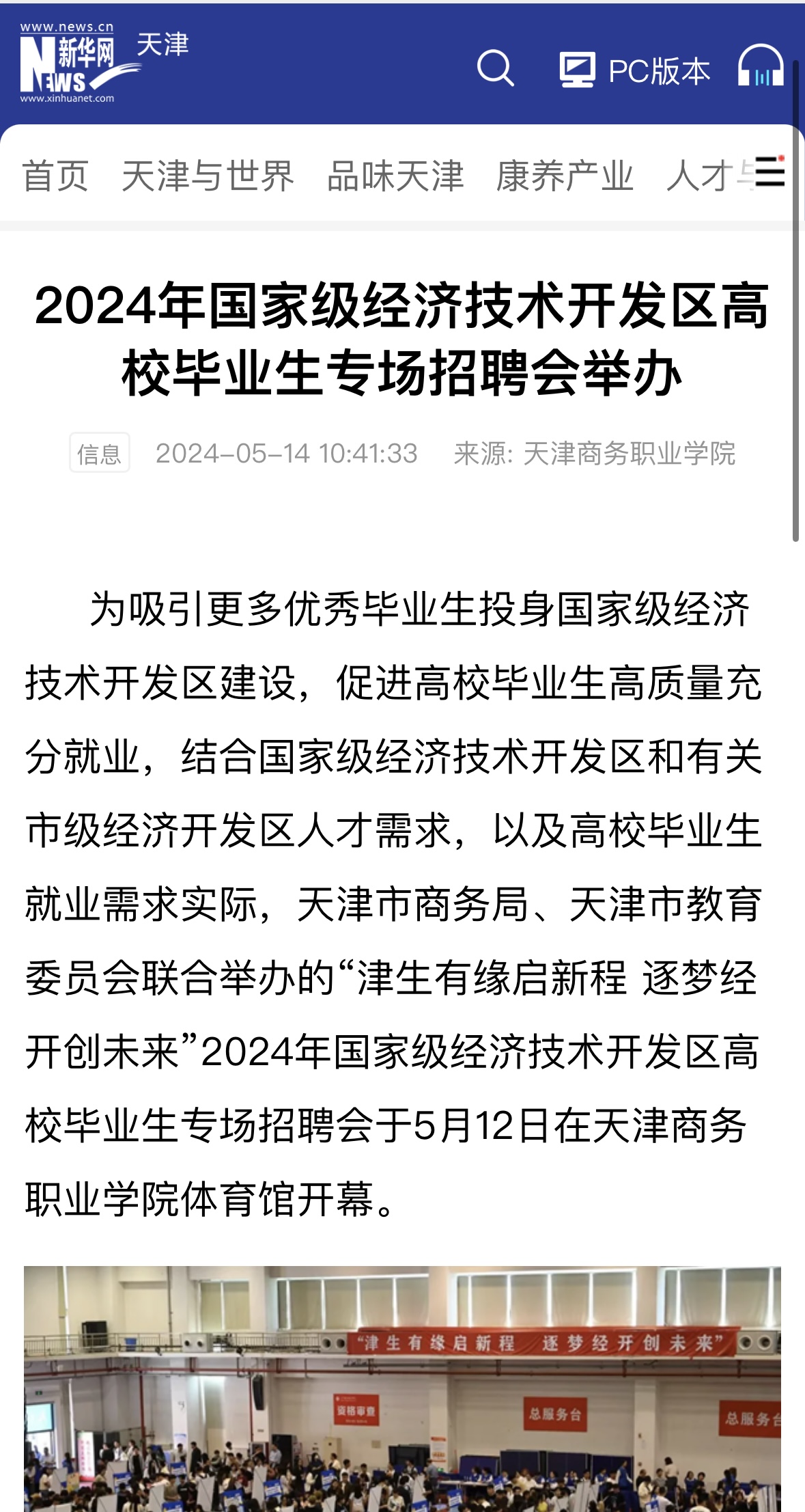 為吸引更多優(yōu)秀畢業(yè)生投身國家級經(jīng)濟(jì)技術(shù)開發(fā)區(qū)建設(shè),促進(jìn)高校畢業(yè)生高質(zhì)量充分就業(yè),結(jié)合國家級經(jīng)濟(jì)技術(shù)開發(fā)區(qū)和有關(guān)市級經(jīng)濟(jì)開發(fā)區(qū)人才需求,以及高校畢業(yè)生就業(yè)需求實際,天津市商務(wù)局、天津市教育委員會聯(lián)合舉辦的“津生有緣啟新程 逐夢經(jīng)開創(chuàng)未來”2024年國家級經(jīng)濟(jì)技術(shù)開發(fā)區(qū)高校畢業(yè)生專場招聘會于5月12日在天津商務(wù)職業(yè)學(xué)院體育館開幕。