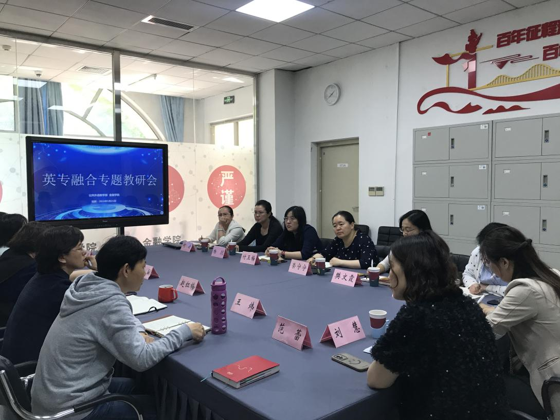 專題教研會上,公共外語教學部對公共英語教學“英專相融”改革的目標和推進情況做了系統說明,闡述了公共英語課程與金融專業群專業要素結合的改革設想,并就金融專業群學生專業崗位的語言需求、就業去向等方面向學院虛心請教;金融學院對學院的專業設置、發展特色、就業方向、英語需求等進行簡要介紹,分享了財富管理專業教學資源庫建設情況;各教研室主任及教師代表深入探討了英語教學與金融各專業教學的結合點、共生點與增效點,通過雙方交流在英語與專業“為何融,融什么,怎樣融”上形成初步共識。