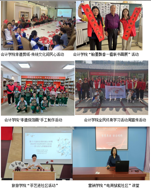 活動周期間,學校聯合河西區、河東區、西青區和津南區等社區圍繞學習貫徹習近平新時代中國特色社會主義思想及黨的二十大、二十屆二中、三中全會精神等主題,舉辦了主題教育講座、知識競賽等活動。精心設計了“能者為師,電商賦能社區”講堂,“彩繽紛拓染美好”漆畫活動,“由染而生,布里生花”扎染活動,“紙韻傳情 非遺剪紙”非遺體驗,“以’書’會友共’畫’桑榆”書畫藝術交流,軟陶工藝和指尖雕刻,文化創意手繪和學畫臉譜,非遺剪紙-傳統文化潤民心,茶文化與茶健康講座等形式多樣的特色活動,以“以文化人、以文惠民、以文潤城、以文興業”為核心理念,致力于普及文化藝術知識,為廣大社區教師、基層社工、志愿服務團隊以及社區學習型組織骨干等群體提供培訓、講座等公益活動,惠及社區居民萬余人次,得到了社區居民的高度贊揚,提升了學校知名度與影響力,進一步打造學校社區教育品牌。