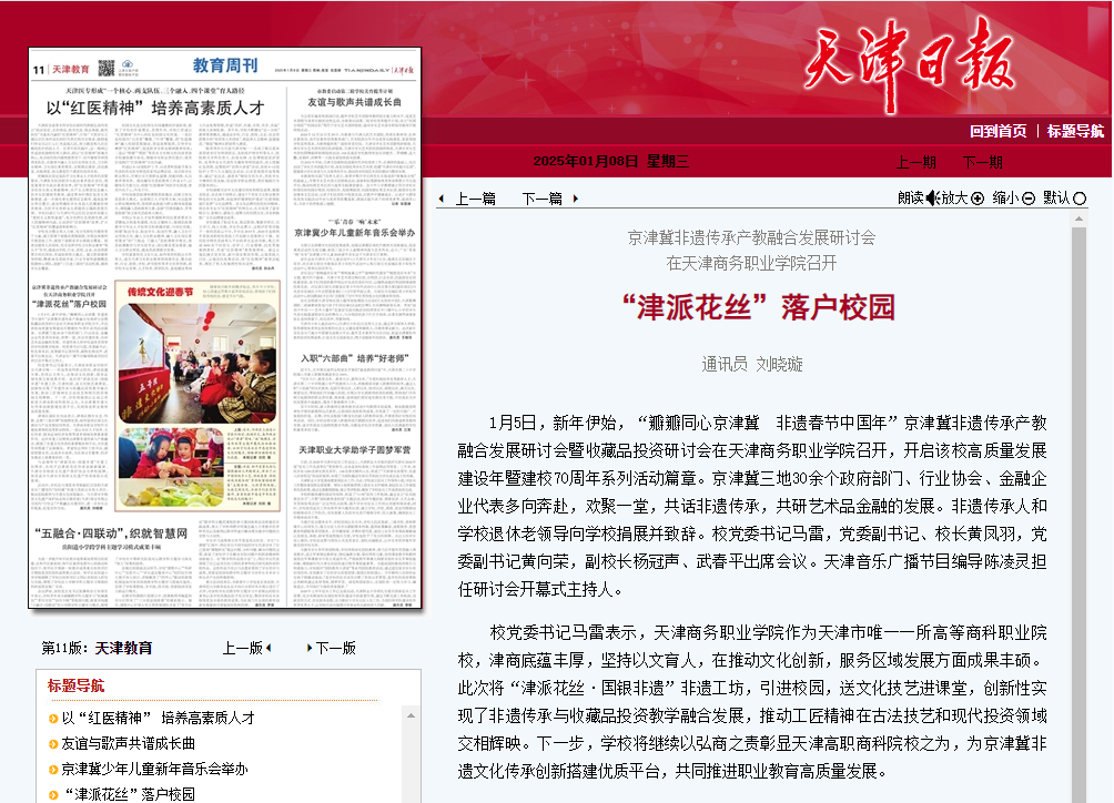 媒體關注 | 【天津日報】京津冀非遺傳承產教融合發展研討會 在我校召開 “津派花絲”落戶校園 | 高質量發展建設年暨建校70周年