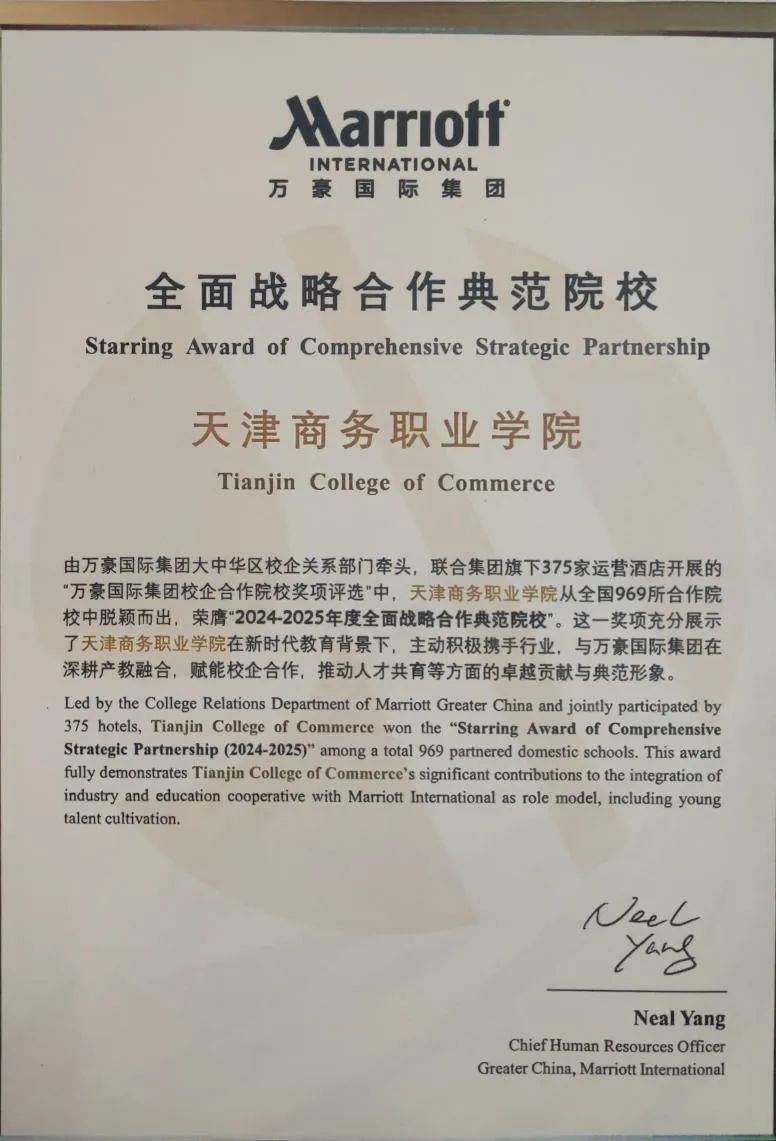 在“五金”建設(shè)的基礎(chǔ)上,校企雙方積極探索“職教出?!甭窂?。2024年10月31日至11月1日,由天津商務(wù)職業(yè)學(xué)院主辦,萬(wàn)豪國(guó)際集團(tuán)、泰國(guó)博仁大學(xué)、帕瓦納·菩提坤職業(yè)學(xué)院支持的“中泰職業(yè)教育國(guó)際產(chǎn)教融合發(fā)展研討會(huì)暨萬(wàn)豪產(chǎn)業(yè)學(xué)院泰國(guó)全境46家海外實(shí)習(xí)基地群合作協(xié)議簽約儀式”成功舉行。榮譽(yù)見(jiàn)證實(shí)力,合作開(kāi)創(chuàng)未來(lái)。我校酒店管理專(zhuān)業(yè)將以“全面戰(zhàn)略合作典范院校”獎(jiǎng)項(xiàng)為新的起點(diǎn),持續(xù)探索產(chǎn)教融合新路徑,書(shū)寫(xiě)職業(yè)教育高質(zhì)量發(fā)展的嶄新篇章,向校慶七十周年獻(xiàn)禮。