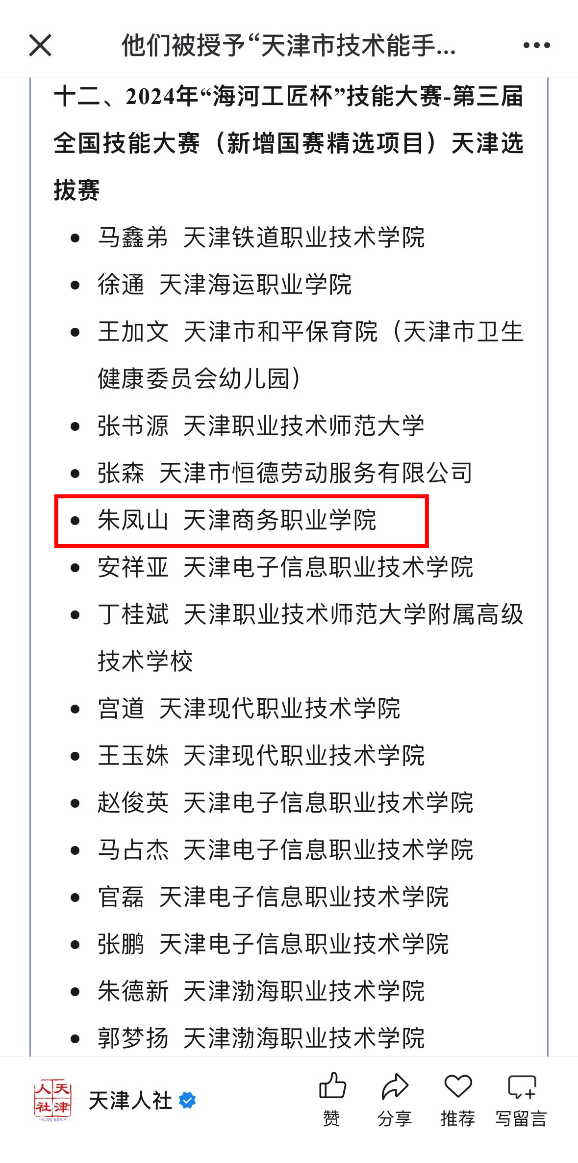 為充分發(fā)揮職業(yè)技能競(jìng)賽引領(lǐng)作用,激勵(lì)廣大勞動(dòng)者特別是青年一代走技能成才、技能報(bào)國(guó)之路,根據(jù)《天津市人民政府辦公廳關(guān)于實(shí)施“海河工匠”建設(shè)的通知》和《天津市職業(yè)技能競(jìng)賽管理辦法》等文件規(guī)定,天津市人社局決定授予李世元等5名“海河工匠”入選者和李雙喜等105名2023年、2024年天津市市級(jí)一類職業(yè)技能競(jìng)賽各賽項(xiàng)第一名獲得者“天津市技術(shù)能手”稱號(hào)。我校信息技術(shù)學(xué)院教師朱鳳山榜上有名,朱鳳山參加2024年天津市市級(jí)一類職業(yè)技能競(jìng)賽“區(qū)塊鏈技術(shù)”賽項(xiàng)榮獲第一名,被授予“天津市技術(shù)能手”稱號(hào)。