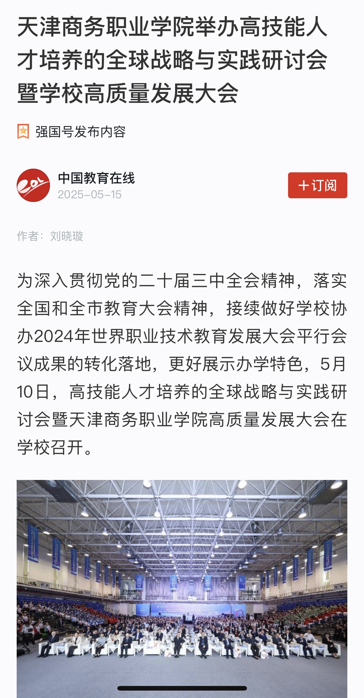 為深入貫徹黨的二十屆三中全會精神,落實全國和全市教育大會精神,接續(xù)做好學校協辦2024年世界職業(yè)技術教育發(fā)展大會平行會議成果的轉化落地,更好展示辦學特色,5月10日,高技能人才培養(yǎng)的全球戰(zhàn)略與實踐研討會暨天津商務職業(yè)學院高質量發(fā)展大會在學校召開。