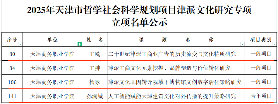 近日,2025年天津市哲學(xué)社會(huì)科學(xué)規(guī)劃項(xiàng)目“津派文化研究專項(xiàng)”立項(xiàng)名單揭曉。據(jù)了解,全市共有29個(gè)單位參與“津派文化研究專項(xiàng)”申請(qǐng)立項(xiàng),其中包括3所高職院校、5所事業(yè)單位及研究機(jī)構(gòu)和21所本科院校,獲批立項(xiàng)總數(shù)176項(xiàng)。經(jīng)過(guò)激烈角逐,廣告學(xué)院能夠脫穎而出,獲得我校4個(gè)獲批立項(xiàng)中的3項(xiàng),展現(xiàn)了學(xué)院在津派文化研究領(lǐng)域的深厚積淀與創(chuàng)新活力,實(shí)現(xiàn)了學(xué)院省部級(jí)科研項(xiàng)目立項(xiàng)新突破。
