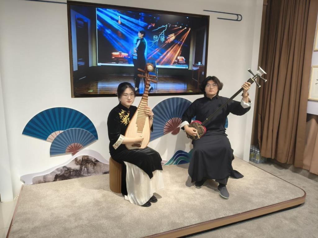 “文化潤心 筑夢前行——展演活動”模塊,展示學生朗誦、戲曲、話劇、聲樂、表演等美育成果。通過大屏幕播放學生優秀的課堂習作、各類比賽的獲獎作品,并且,學生現場演奏評彈、戲曲,展示剪紙技藝。這個模塊還設置集章、打卡等互動環節使觀眾直觀感受動態藝術之美。