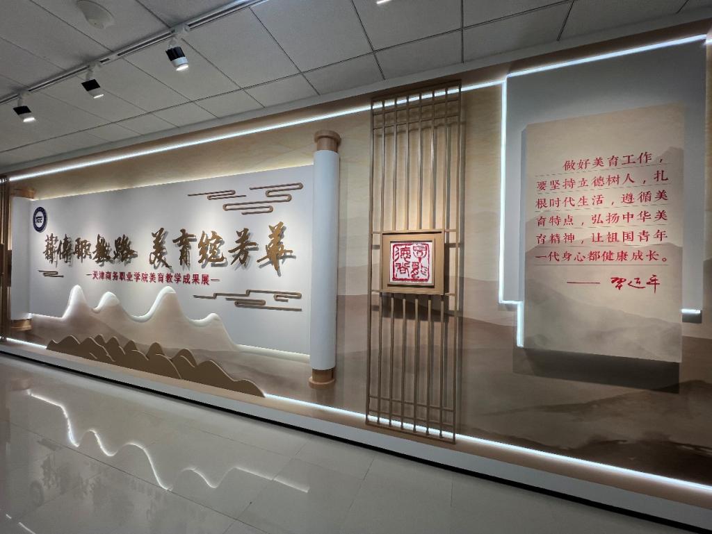 “薪傳職教路 美育綻芳華——主形象”模塊以山水云等自然元素,以及陰陽文篆刻寓意著我校美育工作繼往開來、弦歌不輟;墻上“薪傳職教路,美育綻芳華”為我校退休教師單洪恩題詞,表達了老一輩商職人對母校的祝福。
