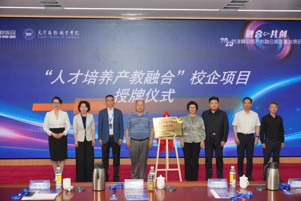 天津商務職業學院旅游學院院長尹明遠與鴻文(天津)產教融合科技集團總經理官澤坤為“人才培養產教融合示范基地”揭牌