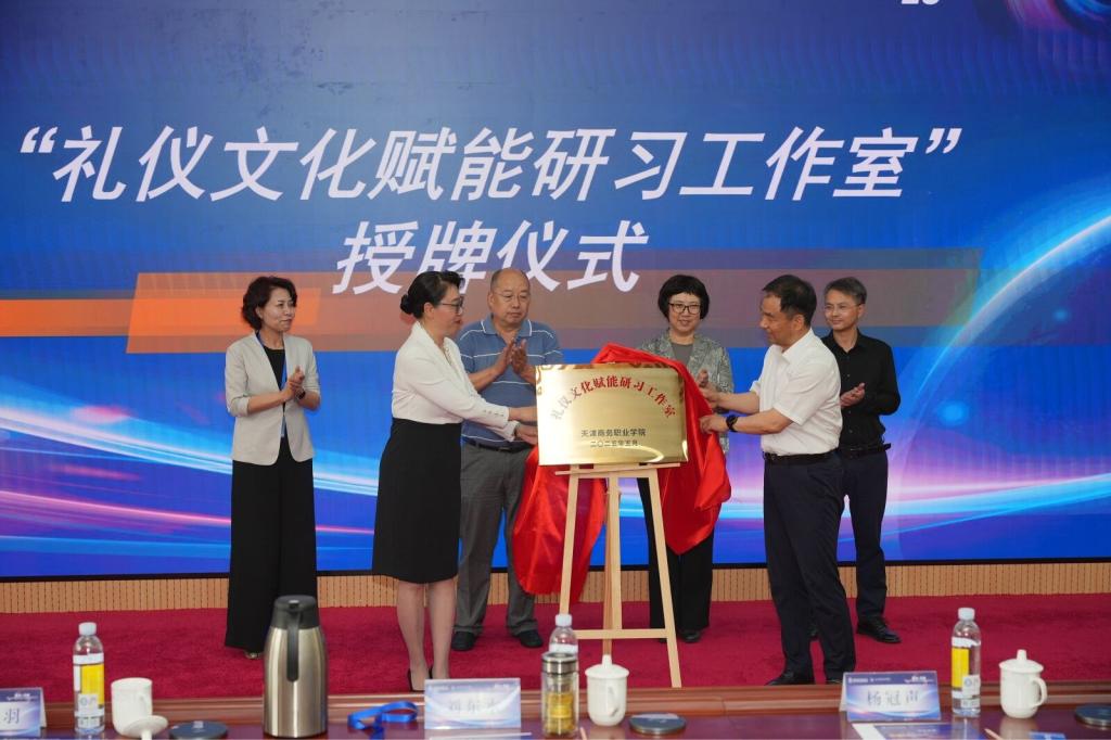 天津商務職業學院副校長楊冠聲與天津市教育科學研究院禮儀文化賦能項目負責人項琳為“禮儀文化賦能研習工作室”揭牌