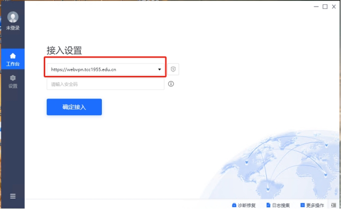 3.在客戶端接入設(shè)置位置輸入學(xué)校webvpn地址:https://webvpn.tcc1955.edu.cn,點(diǎn)擊確定接入