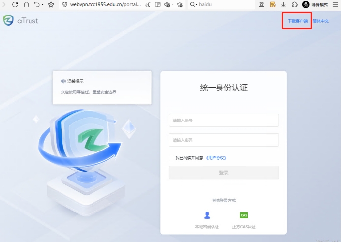1.先在瀏覽器輸入學(xué)校webvpn地址:https://webvpn.tcc1955.edu.cn,點(diǎn)擊右上角下載客戶端。