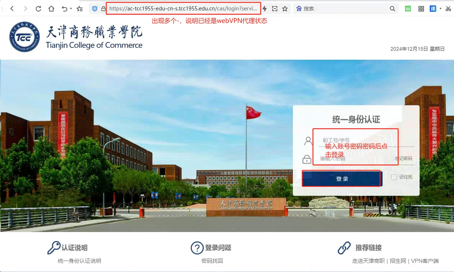 1.第一次使用時,先在瀏覽器輸入學(xué)校webvpn地址:https://webvpn.tcc1955.edu.cn,并敲擊回車。