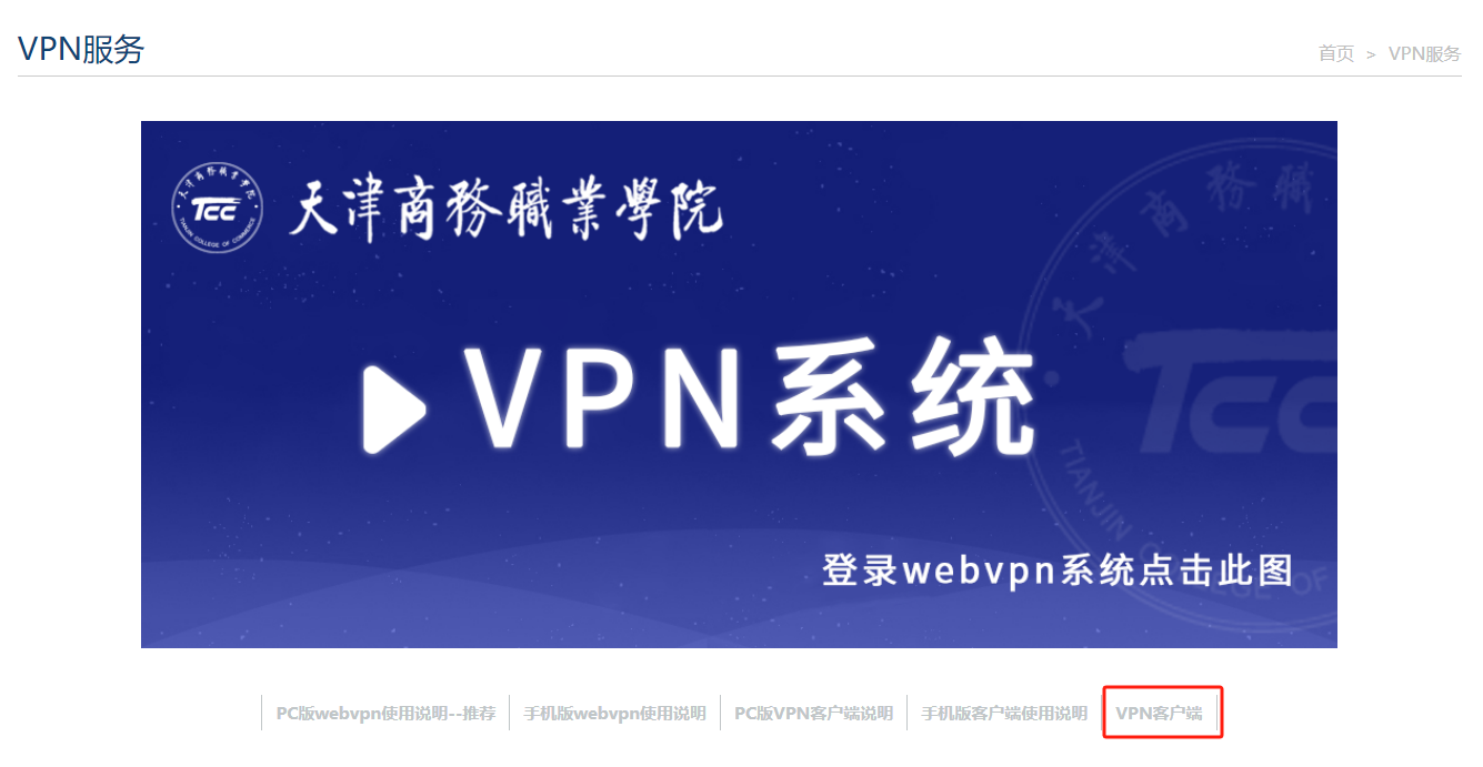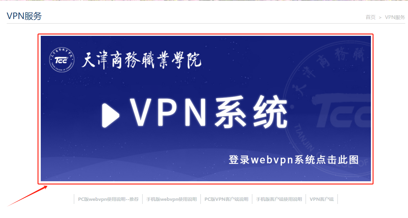 1. 第一次使用時,先在學(xué)校官網(wǎng)導(dǎo)航欄里點擊【VPN服務(wù)】。