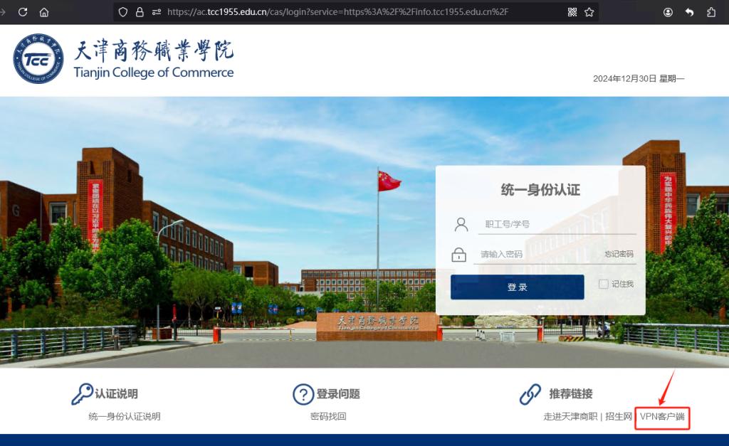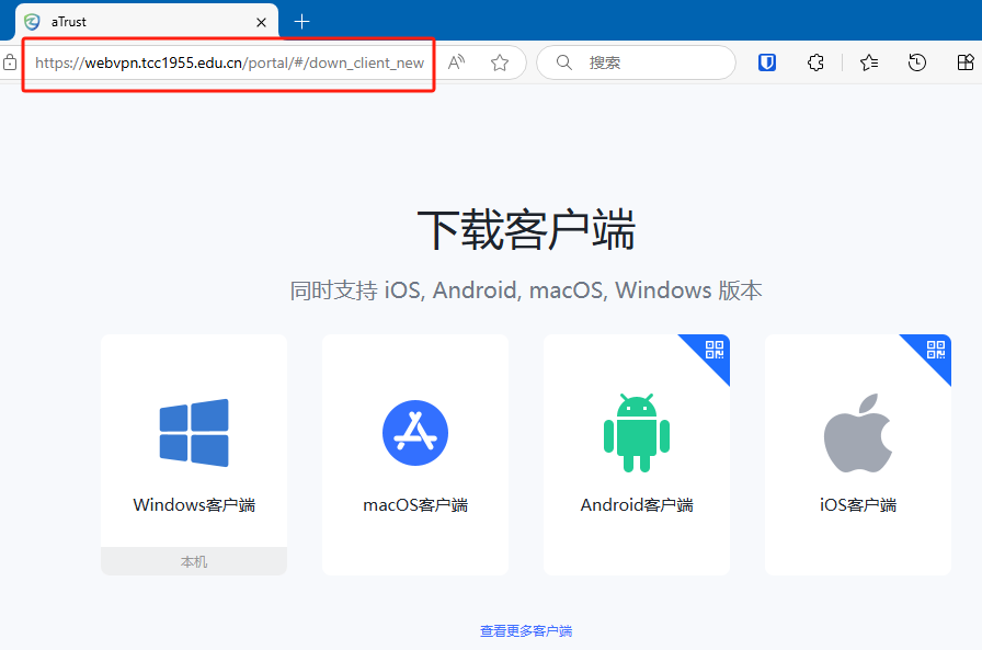 或者直接瀏覽器打開客戶端下載鏈接:https://webvpn.tcc1955.edu.cn/portal/#/down_client_new。